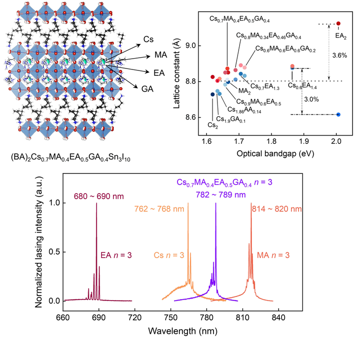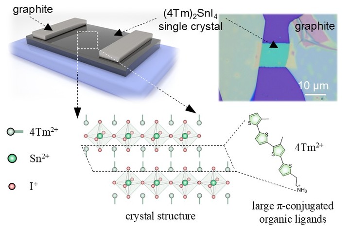 - Publications - (‡: co-first author; *: corresponding author) - 2025 - 1. Ming Xia‡, Tianyu Wang‡,Yuan Lu, Yahui Li, Baini Li, Hongzhi Shen, Yunfan Guo, Yi Yu, Jichen Dong*, Letian Dou*, Yunqi Liu, Enzheng Shi*, Kinetic Wulff-shaped heteroepitaxy of phase-pure 2D perovskite heterostructures with deterministic slab thickness, Nat. Synth. 2025, 4, 380-390.- We report the discovery of kinetic Wulff-shaped heteroepitaxy growth in halide perovskites, enabling the realization of well-defined 2D halide perovskite epitaxial heterostructures with deterministic slab thickness (n=1-3) in high phase purity. Optoelectronic devices based on these heterostructures exhibit substantial rectification ratios and reliable switching behaviors under both optical and electrical inputs. - 2. Yahui Li, Zhenzhu Li, Yanxin Han, Runchen Lai,Jingjing Yao, Cunquan Li, Ming Xia, Hongzhi Zhou, Xin Sheng, Baini Li, Yiling Zhang, Tianyu Wang, Xiaohuo Shi, Jianwei Zhao, Yunfan Guo, Xiaoze Liu, Aron Walsh, Enzheng Shi*, Dual oxidation suppression in lead-free perovskites for low-threshold and long-lifespan lasing, Adv. Mater. 2025, 2418931.- We developed a dual oxidation suppression strategy to suppress oxidation of Sn2+ in two-dimensional (2D) tin halide perovskites, i.e. adopting an oxygen-free two-step growth to enhance the crystal quality and incorporating electron-donating biuret molecules to coordinate with Sn2+ during the crystal growth, which led to the substantial reduction of lasing threshold to <1 μJ/cm² in (PEA)2MASn2I7. This represents the lowest value in lead-free perovskite nanolasers and approximately one order of magnitude lower than those previously reported for tin-based nanolasers. Investigations into the spontaneous photoluminescence (PL) and stimulated lasing emission revealed that 2D tin perovskites exhibited superior photostability and lasing stability compared to their lead counterparts. Specifically, lasing intensity of (PEA)2MA2Sn3I10 constantly increased by >300% under optical pumping and the lasing threshold decreased by ~17%. Our findings highlight the prospect of 2D tin halide perovskites as lead-free gain materials and cavities for solution-processed nanolasers with low lasing thresholds and exceptional stability. - 3. Yahui Li‡, Ming Xia‡, Yanxin Han‡, Zhihao Gong‡, Qi Yao, Hongzhi Zhou, Yiling Zhang, Tianyu Wang, Lijun Chai, Xin Sheng,Haiming Zhu, Long Yuan, Hua Wang*, Enzheng Shi*, Robust A-site Cation Engineering for Stable 2D High-n Tin Perovskite Homologs with Bridged Lasing Emission Gaps, Angew.Chem. Int. Ed. 2025, e202512914.- Two-dimensional high-n halide perovskites (e.g. n = 3) offer a unique platform for stable, efficient optoelectronics by synergizing improved stability with bulk-like carrier transport. However, their development is hindered by the intrinsic trade-off between continuous bandgap tunability and structural integrity. Here, we report robust A-site cation engineering to overcome these limitations in n = 3 tin perovskites. By incorporating distinct cations, we synthesized a library of homologous single crystals, including metastable (BA)2Cs2Sn3I10 (BA+: butylammonium) via growth kinetics control. It is revealed that A-site cations critically govern structural symmetry, exciton-phonon coupling, lasing etc. Tailoring cation composition enables the continuous bandgap tuning (1.62–2.01 eV) with minimal lattice mismatch (<3.6%). A-site cation engineering idealized the perovskite lattice and improved the crystal quality, e.g., the multi-cation (BA)2Cs0.7MA0.4EA0.5GA0.4Sn3I10 (MA+: methylammonium, EA+: ethylammonium, GA+: guanidinium) achieves a long carrier lifetime (15.1 ns), nearly three times that of containing single A-site, and then increases diffusion length to >1 μm. The n = 3 tin perovskites with multi-cation exhibited exceptional phase stability and the corresponding nanolaser bridged the emission gaps between single-A-cation analogs, delivering a low threshold and unprecedented stability.- 4. Baini Li, Tianyu Wang, Zhongpu Wang, Yunfan Guo*, Enzheng Shi*, Advances in Highly Aligned and Ultraclean Horizontal Carbon Nanotube Arrays, ACS Appl. Mater. Interfaces 2025, doi.org/10.1021/acsami.5c12562. - 5. Tianyu Wang, Baini Li, Ming Xia, Yiling Zhang, Hongzhi Shen, Zhongpu Wang, Xin Sheng, Yao Gao, Enzheng Shi*, Van der Waals integrated single-crystal tin perovskite transistors towards ultra-sensitive photodetection, ACS Nano, 2025, accepted.- Two-dimensional (2D) tin halide perovskites have emerged as promising lead-free semiconductors with strong optical absorption and high carrier mobility. While polycrystalline films have achieved impressive device performance, their intrinsic charge transport and exciton dynamics remain obscured by grain-boundary associated defects, limiting the fundamental understanding of material properties and optimization of device performance. Herein, by using bulky π-conjugated 4Tm+ cations, we synthesized 2D (4Tm)2SnI4 single crystals and assembled their van der Waals field effect transistors, exhibiting high hole mobility up to 5.1 cm2 V-1 s-1 at room temperature, more than two times higher than that of polycrystalline counterparts. The efficient charge transport in single crystals allows phonon-scattering dominated process persisting to lower temperature, leading mobility increasing to 10.3 cm2 V-1 s-1 at 120 K. Also, the single-crystal nature ensures remarkable responsivity/specific detectivity of 1.6 × 106 A W-1 / 4.2 × 1016 Jones under 550-nm illumination, ranking among the best Pb and Sn perovskite photodetectors. Crucially, the transistor modulation allows the gate-voltage tunable contrast in imaging for usage as pixel-active image sensors. This work uses single-crystal 2D tin perovskites as a platform for probing intrinsic electronic/optoelectronic properties while showcasing their potential in current modulation, high-sensitive photodetection, and scalable imaging systems. - 6. Jingjing Yao‡, Yahui Li‡, 